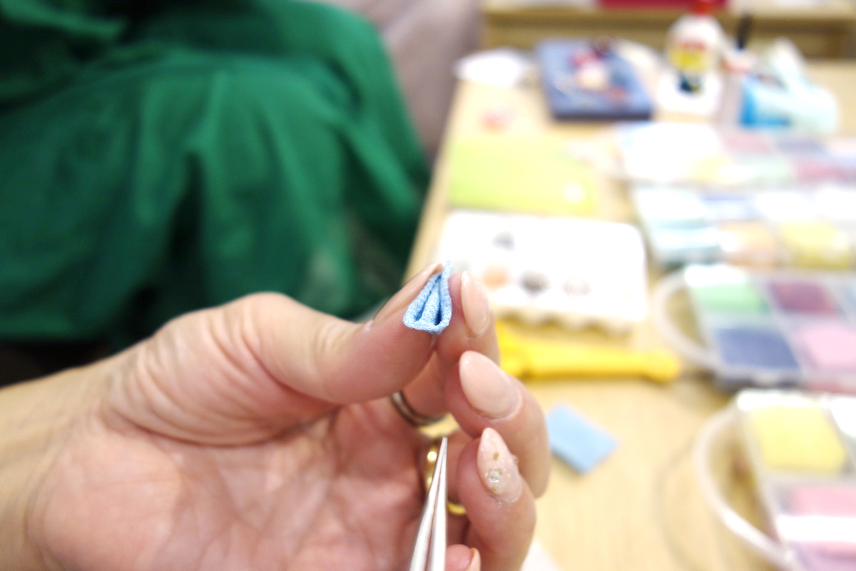 選んだ布の厚みなどによっても、若干難しさが変わってくるようですが、次第に皆さまコツを掴まれてきたようで、ピンセットを上手に使い、1枚ずつ花びらを完成させていきます。先生は普段、糊を使って花びらを留めるそうですが、今回はすぐにお持ち帰りいただけるように、ボンドと速乾性の接着剤を使用します。