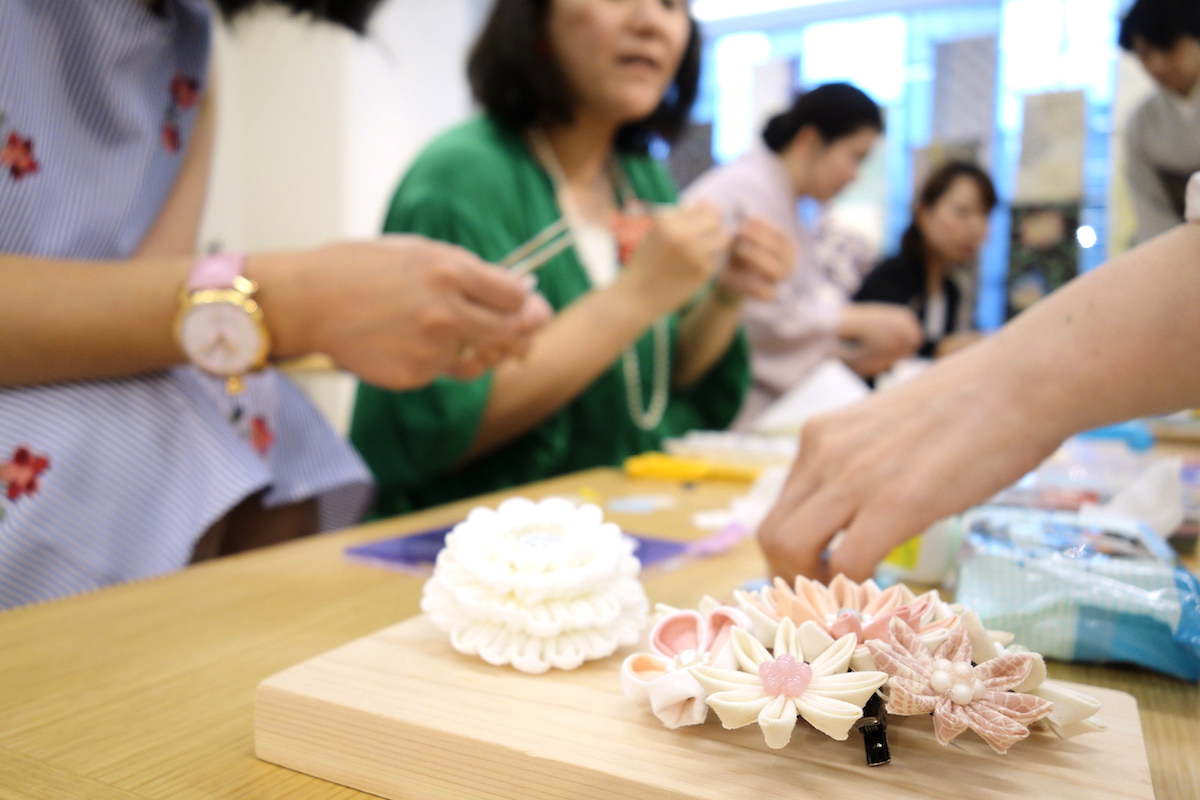 古典的なつまみ細工のほか、普段使いにもぴったりなカジュアルラインのオリジナル作品がKITTE展示会でも大好評を博した「つゆつきのつまみ細工」。つゆつきの土田由紀子先生にお越しいただき、オリジナル小物をつくる体験イベントを大阪梅田店で開催いたしました。